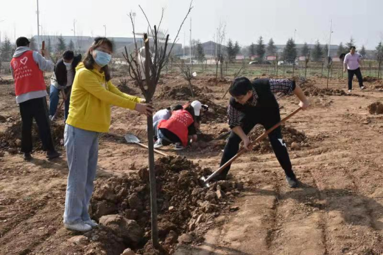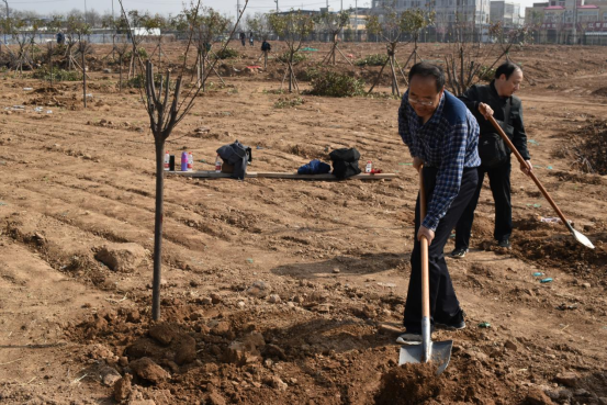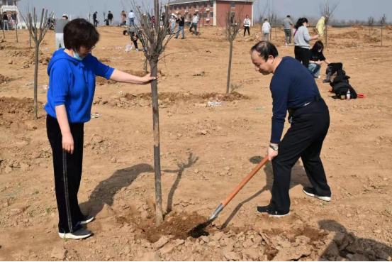 植树活动开始后,大家纷纷挽起袖子,拿起铁锹,积极投入到义务植树活动中。大家配合默契,干劲十足,或挥锹铲土,或扶苗培土,或踏土夯实,每道工序都专注细致、一丝不苟,合力栽下一棵棵树苗,一派忙碌有序的劳动场景,处处洋溢着植绿护绿的欢声笑语。在师生的共同努力下,80棵树苗昂然挺立,迎来了它们在渭师的第一个春天,不久将成为校园里一道靓丽的风景。