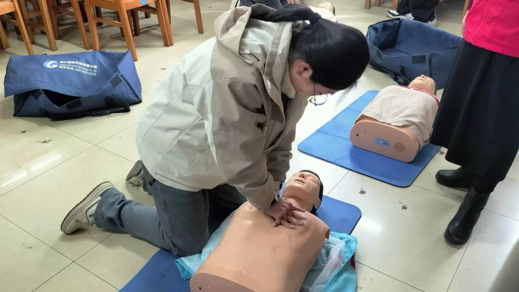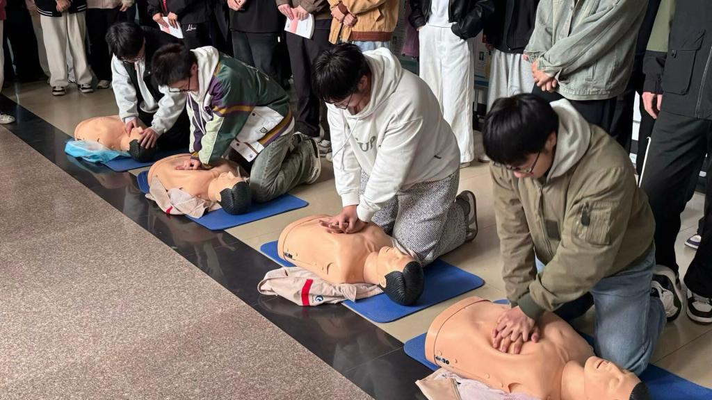 实操环节,同学们在讲师的指导下分组进行了模拟演练,认真练习按压深度和频率,亲身体验心肺复苏的标准操作流程。校医务室医护人员全程参与,现场为同学们提供专业指导。